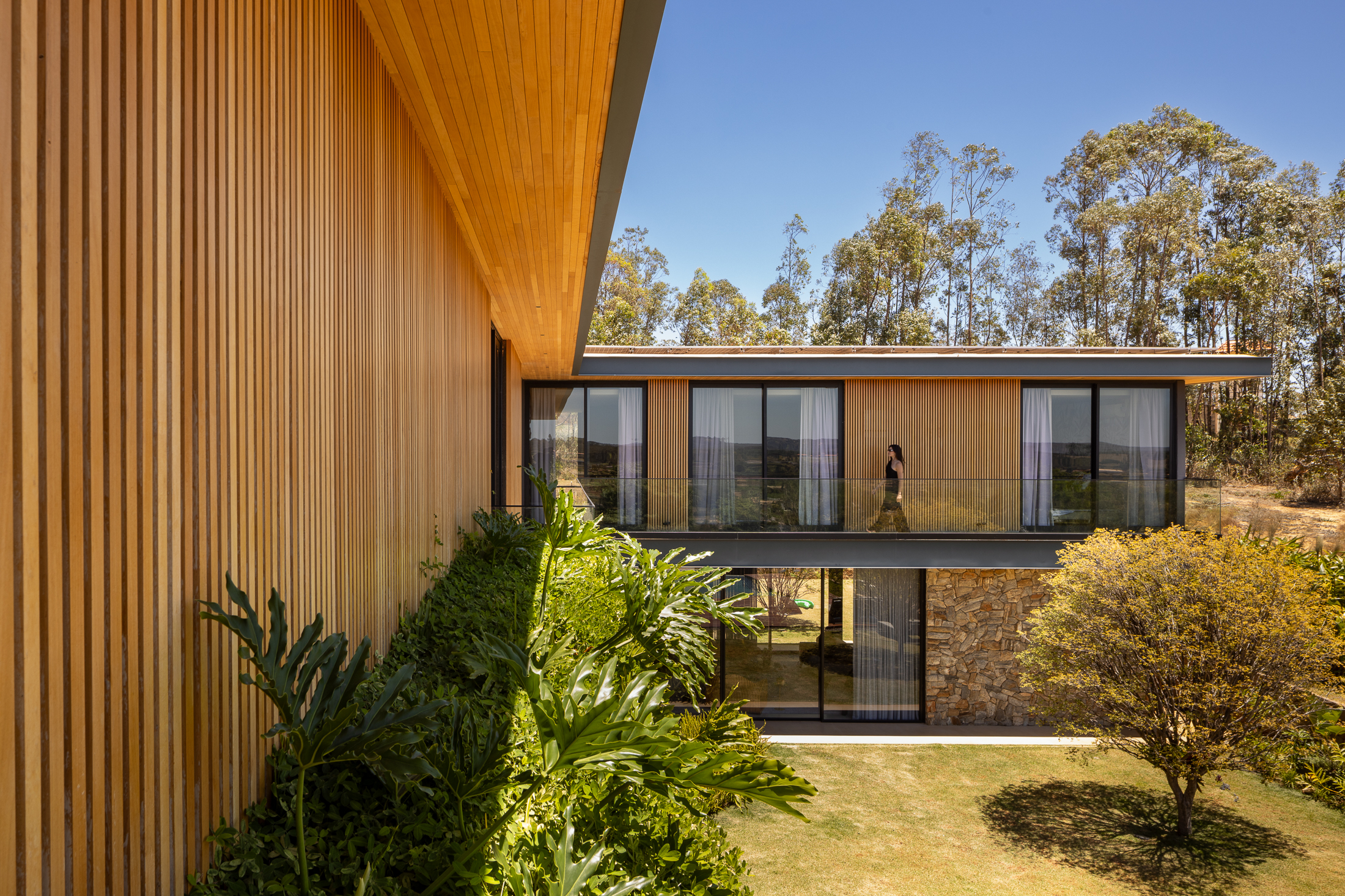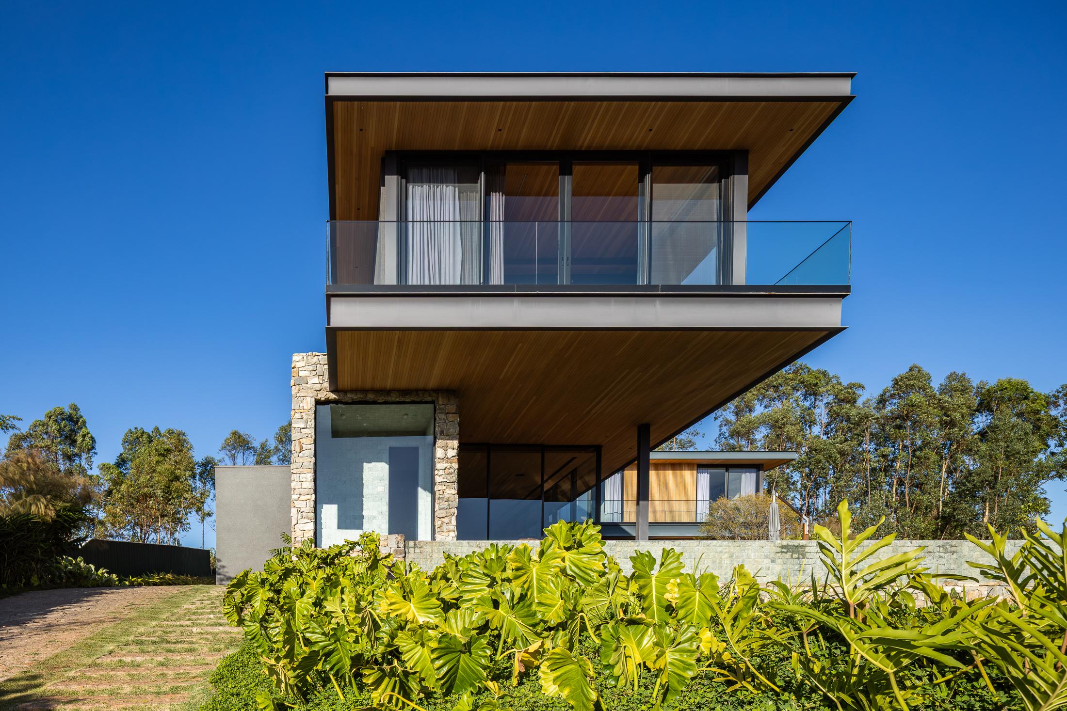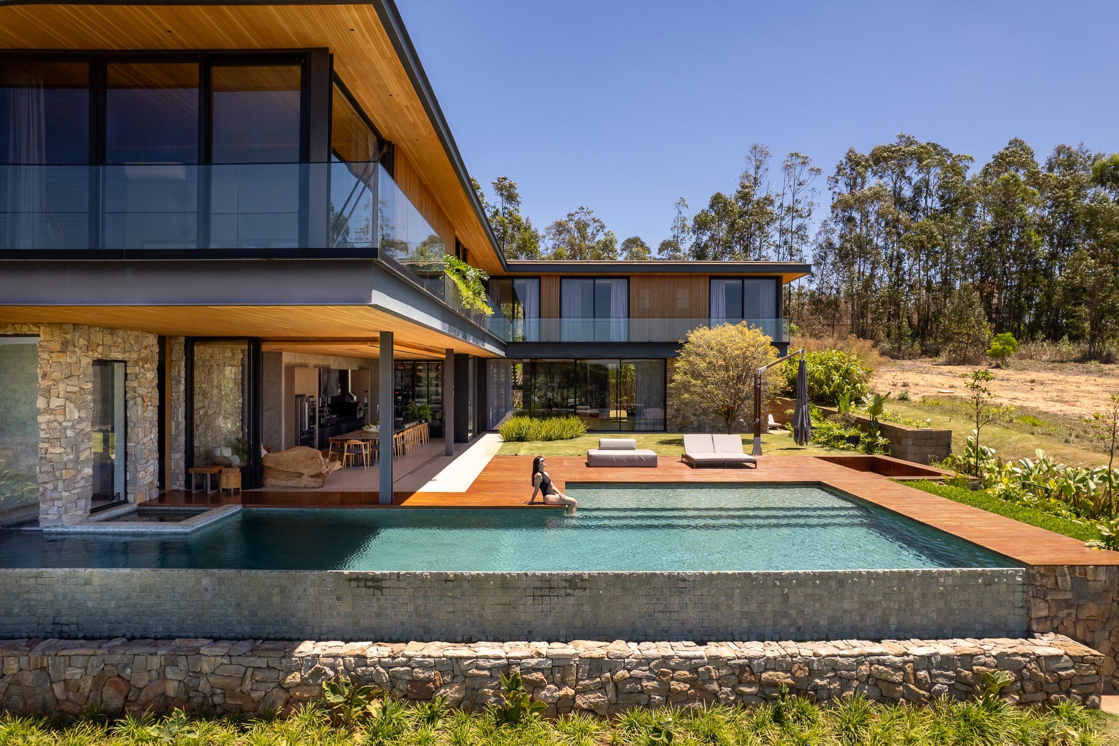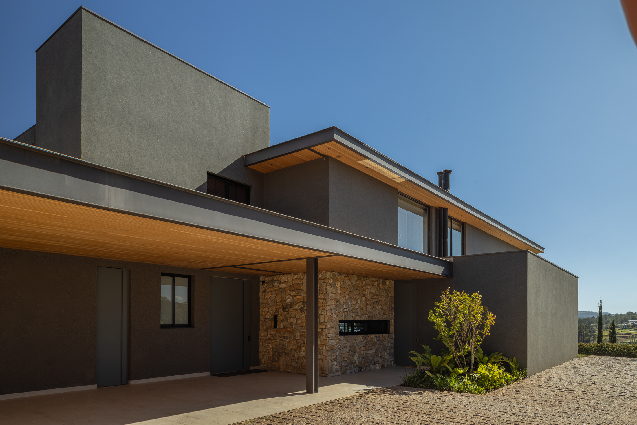 A Casa Guapeba foi idealizada para valorizar a relação entre arquitetura e natureza, respeitando a topografia do terreno e criando volumes que se encaixam de forma fluida na paisagem. Trabalhamos com linhas horizontais e materiais como madeira, pedra e vidro para trazer elegância e equilíbrio. A integração entre os ambientes internos e externos foi essencial para proporcionar conforto e convivência, sempre em harmonia com o entorno natural.