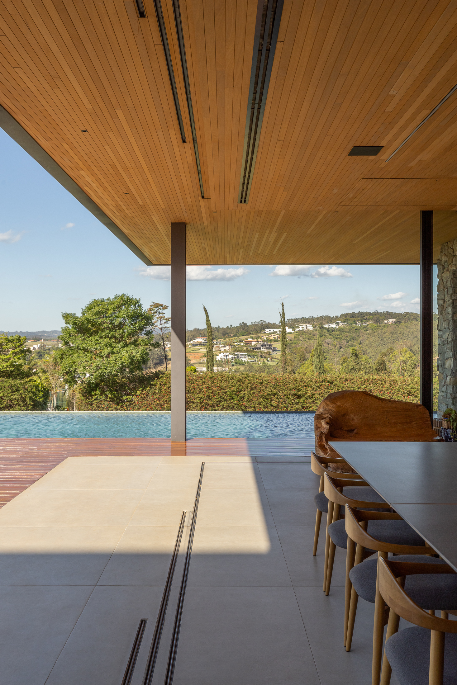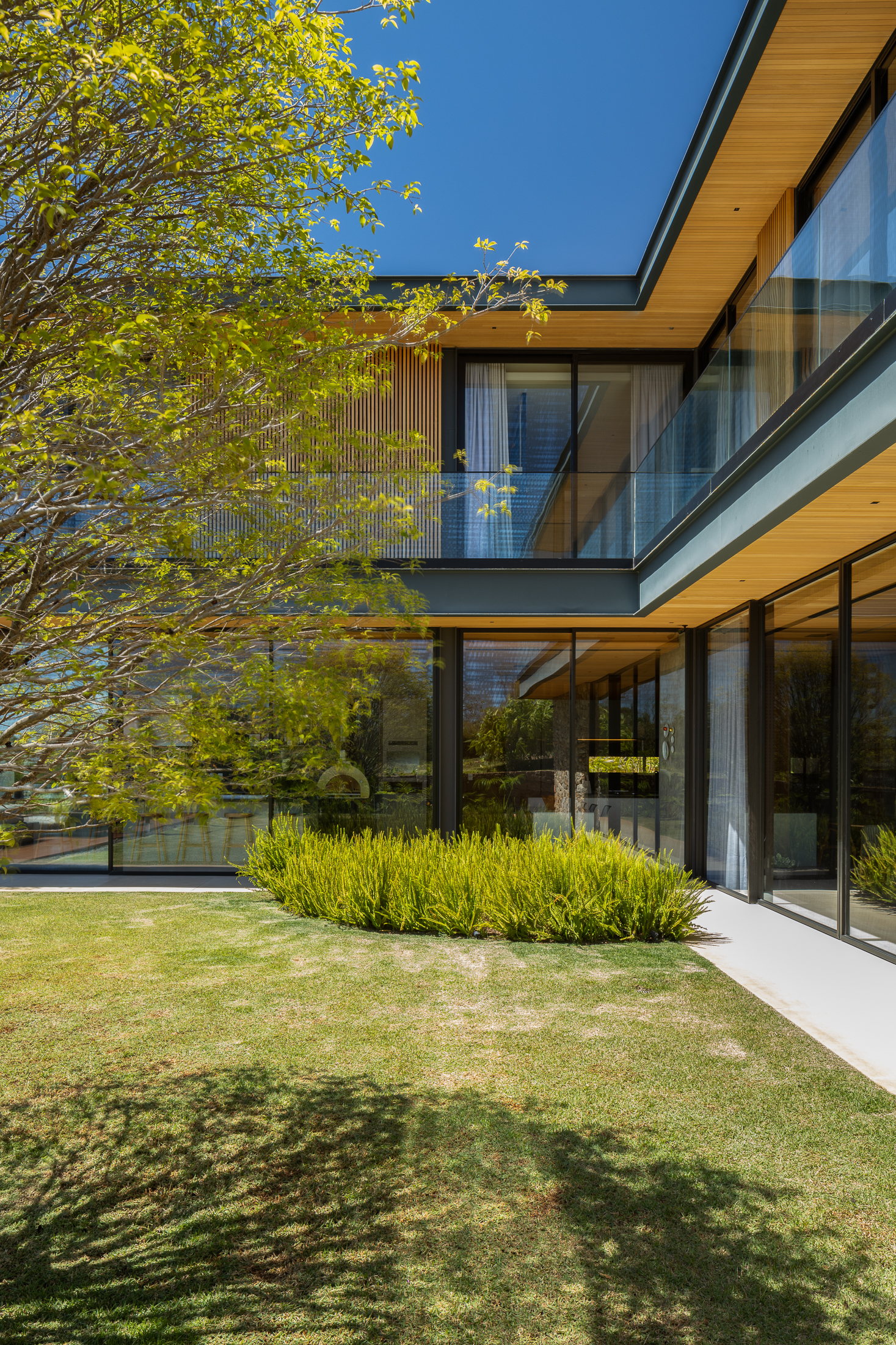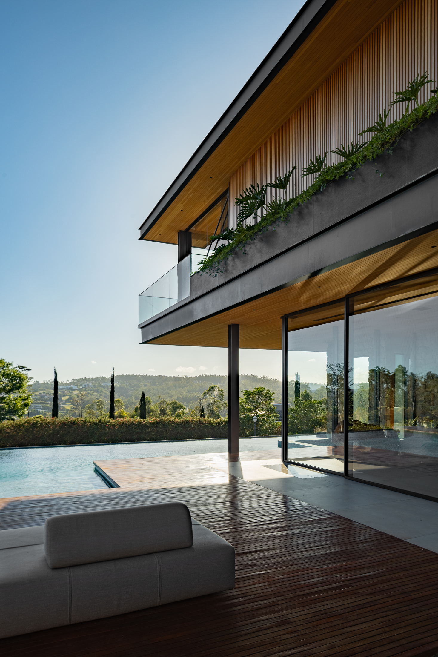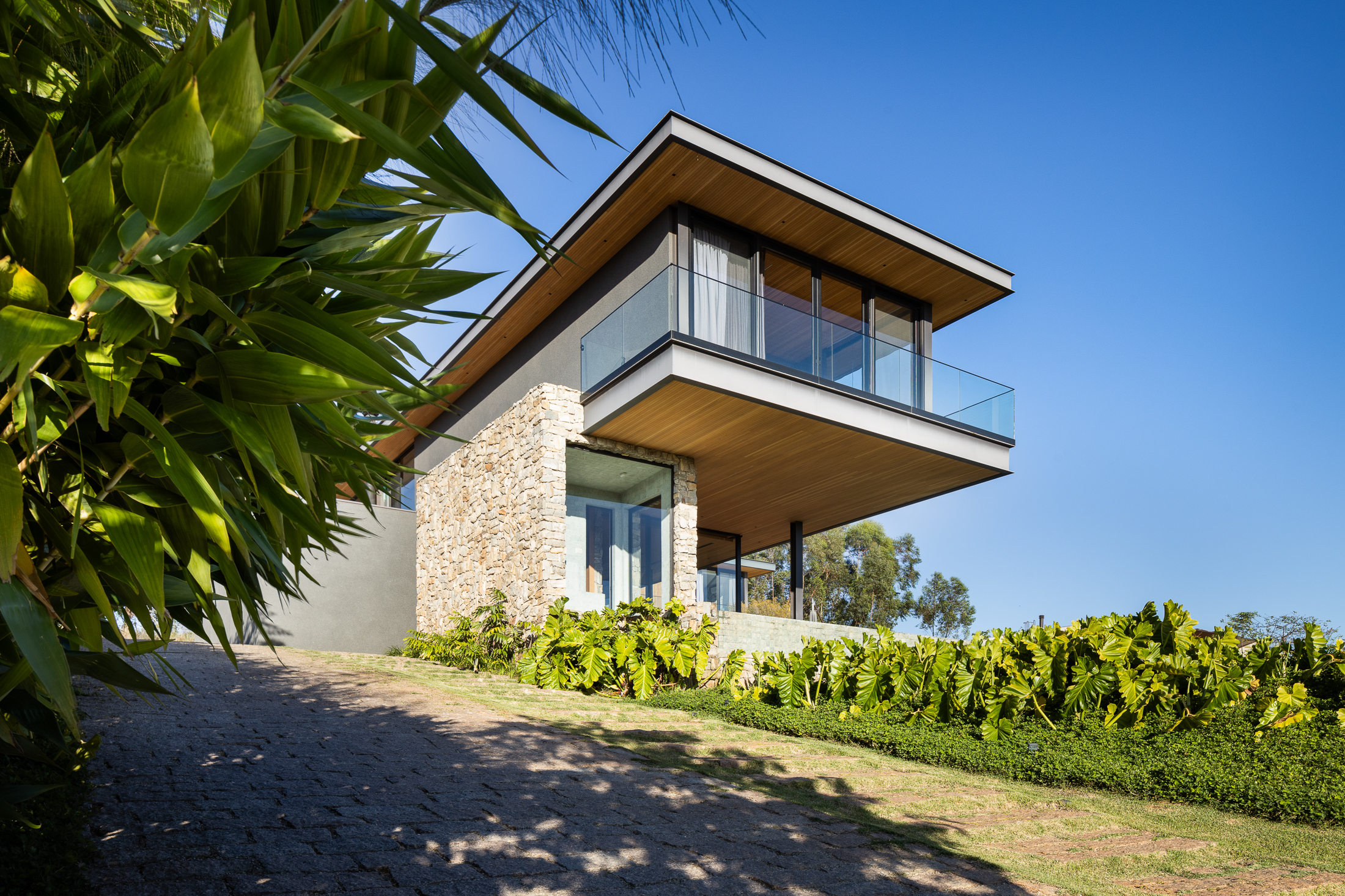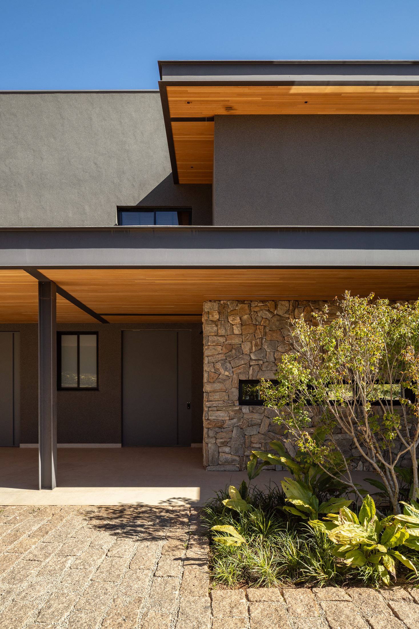 A Casa Guapeba foi idealizada para valorizar a relação entre arquitetura e natureza, respeitando a topografia do terreno e criando volumes que se encaixam de forma fluida na paisagem. Trabalhamos com linhas horizontais e materiais como madeira, pedra e vidro para trazer elegância e equilíbrio. A integração entre os ambientes internos e externos foi essencial para proporcionar conforto e convivência, sempre em harmonia com o entorno natural.
