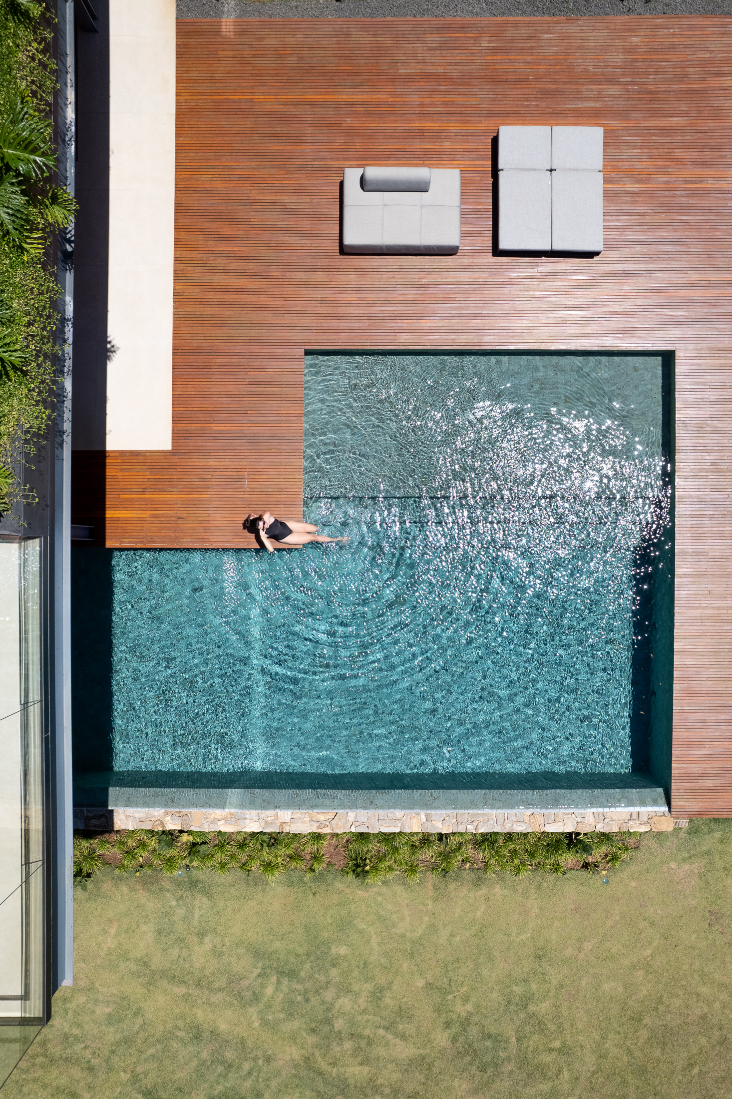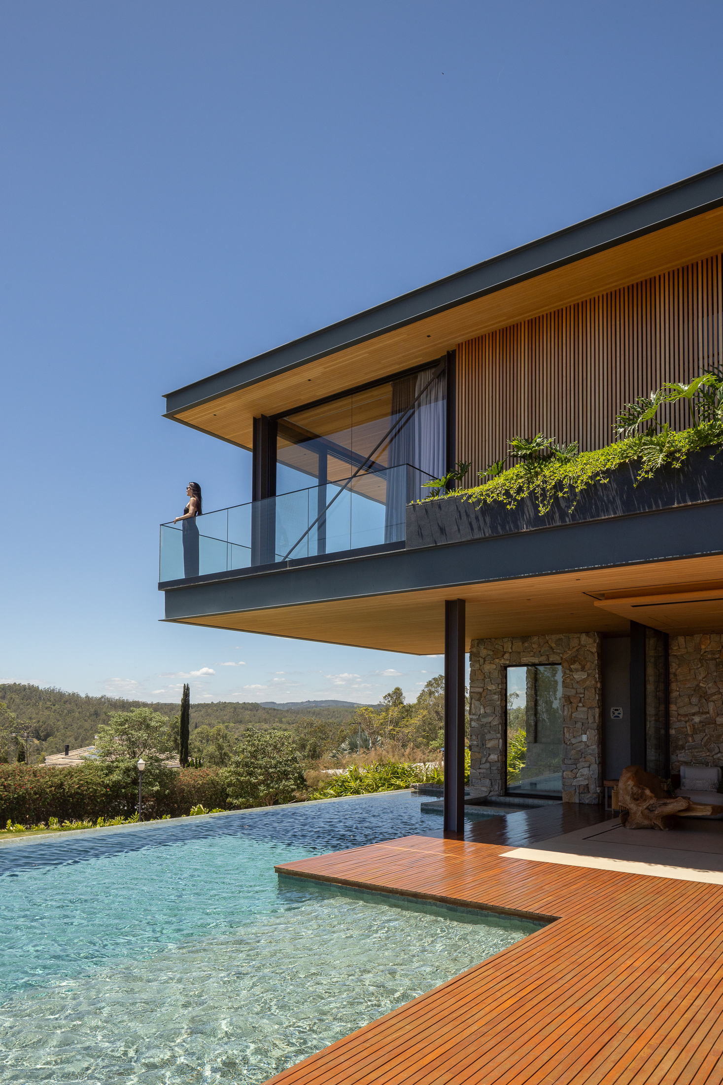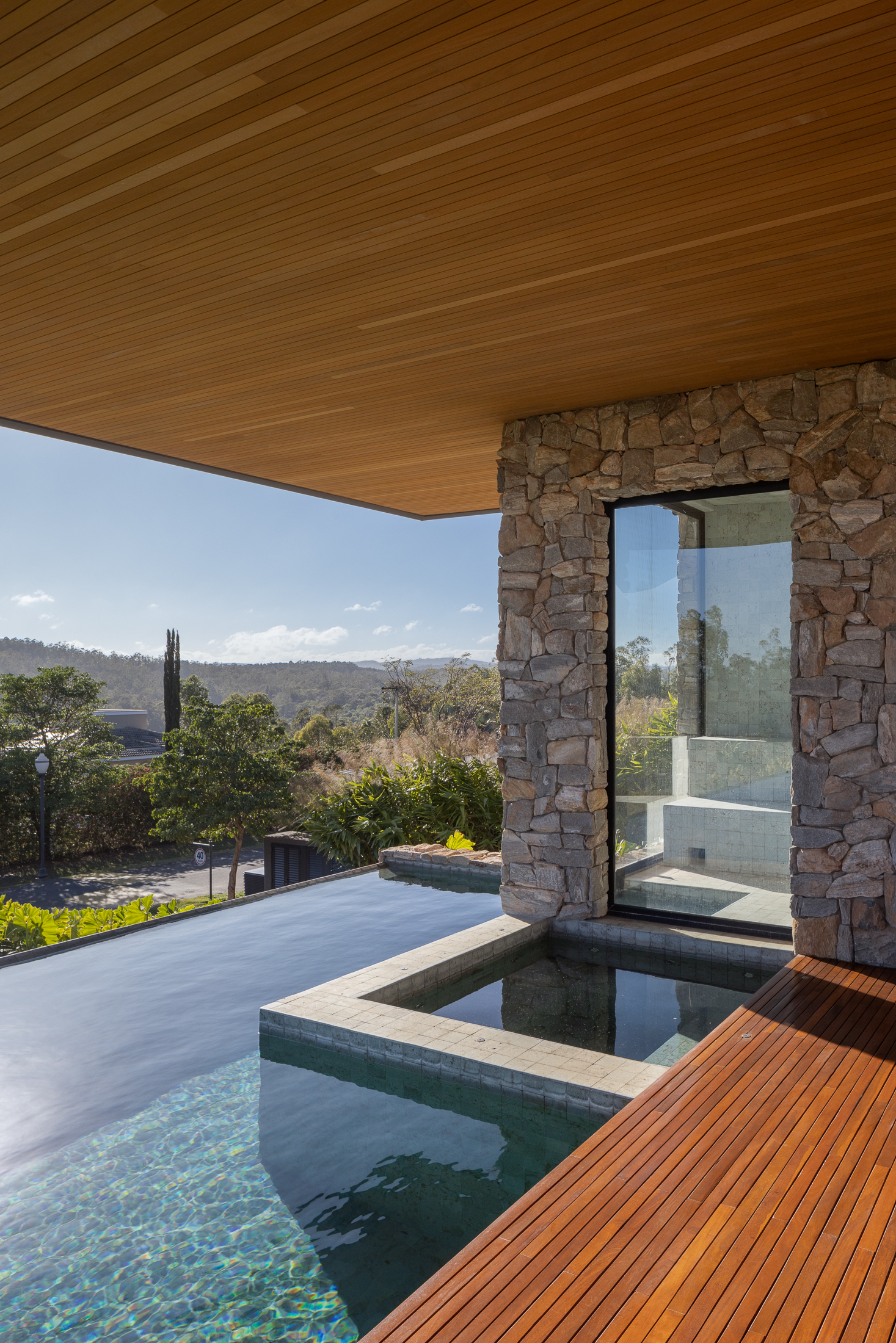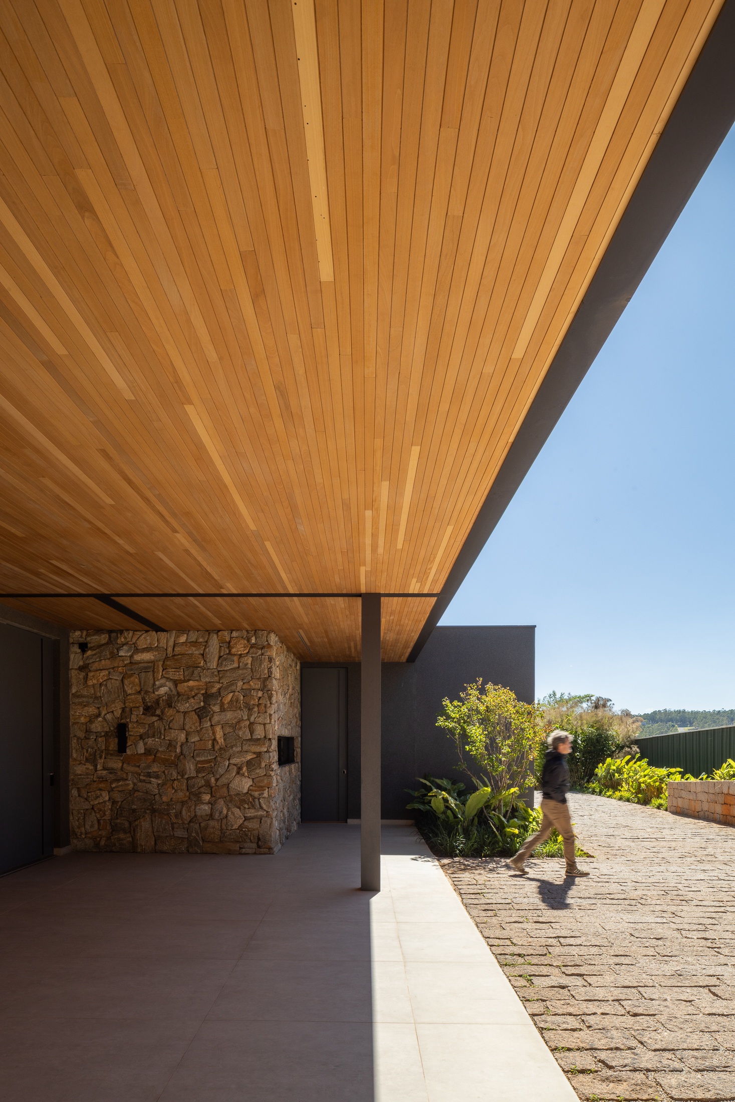 A Casa Guapeba foi idealizada para valorizar a relação entre arquitetura e natureza, respeitando a topografia do terreno e criando volumes que se encaixam de forma fluida na paisagem. Trabalhamos com linhas horizontais e materiais como madeira, pedra e vidro para trazer elegância e equilíbrio. A integração entre os ambientes internos e externos foi essencial para proporcionar conforto e convivência, sempre em harmonia com o entorno natural.