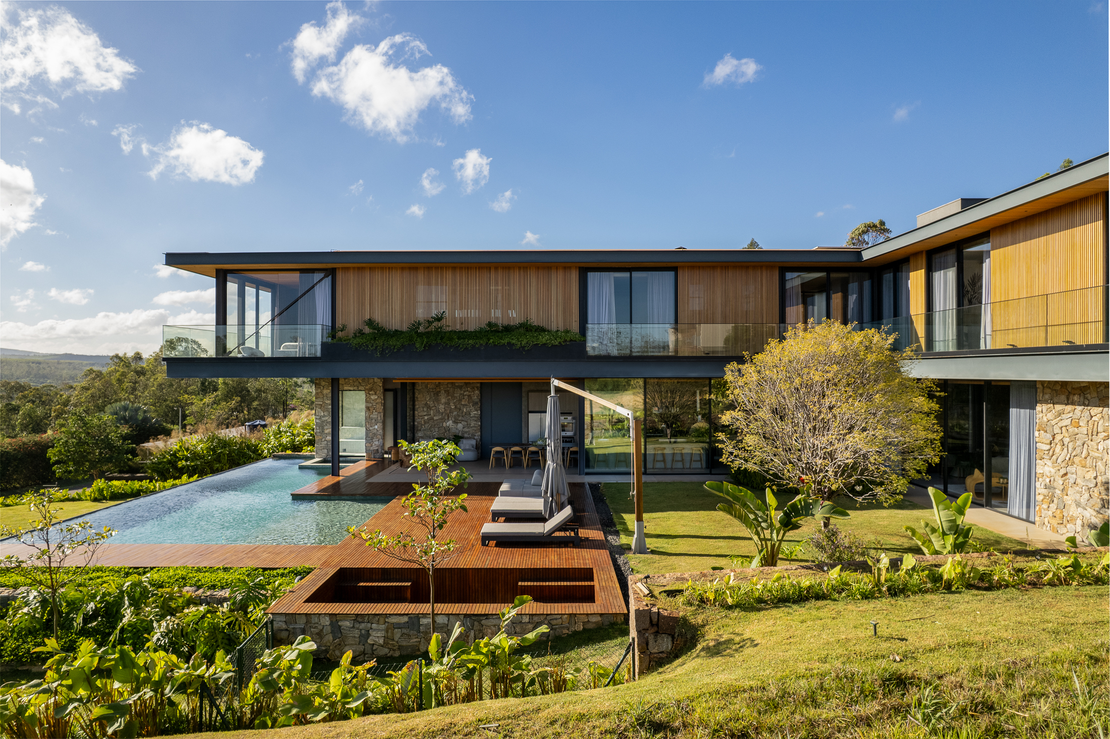 A topografia natural, destacando volumes que se adaptam ao terreno em diferentes níveis. As linhas horizontais reforçam a sensação de leveza e continuidade, conectando a arquitetura ao paisagismo cuidadosamente planejado.
