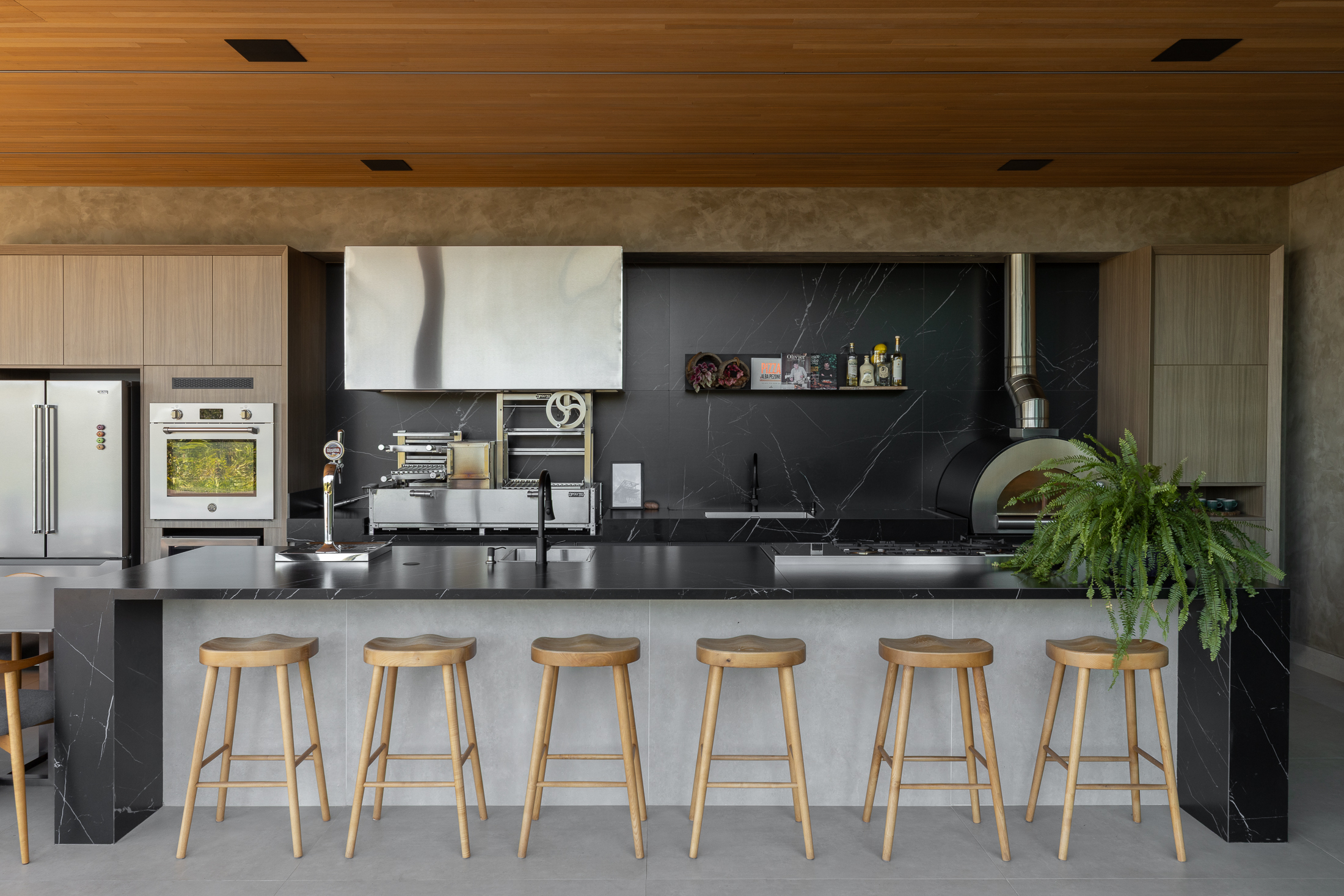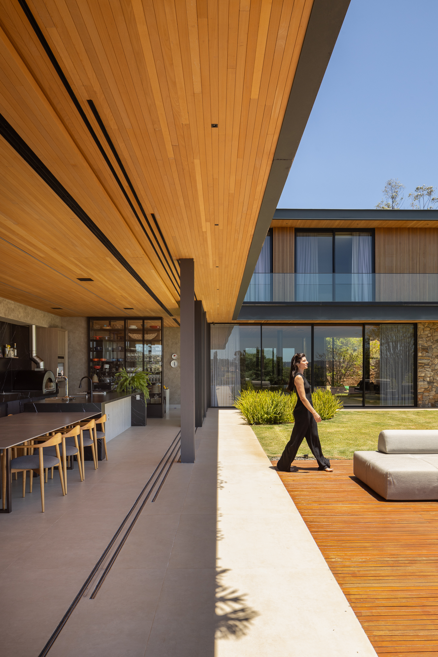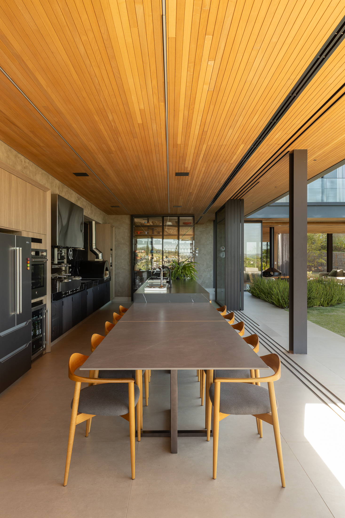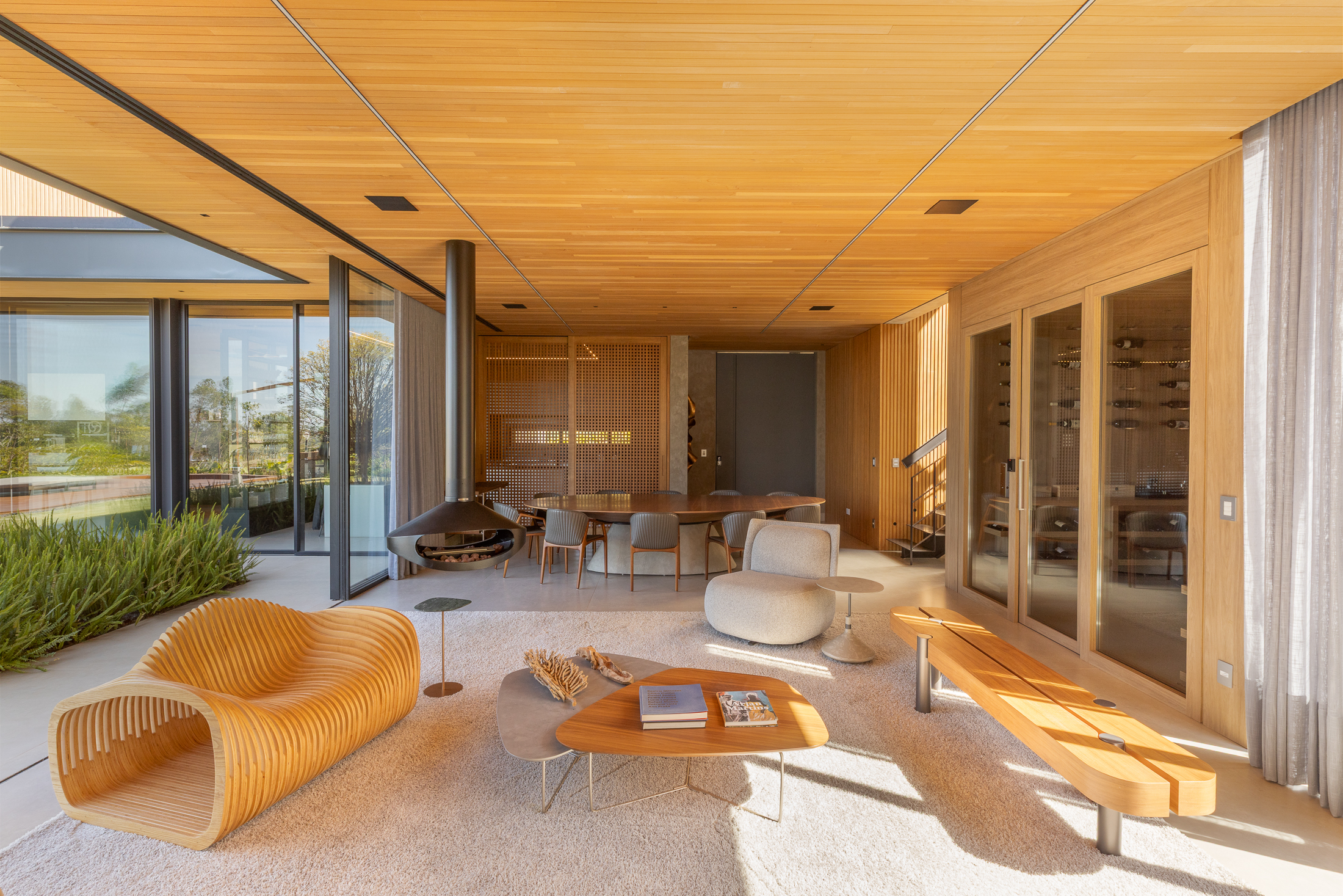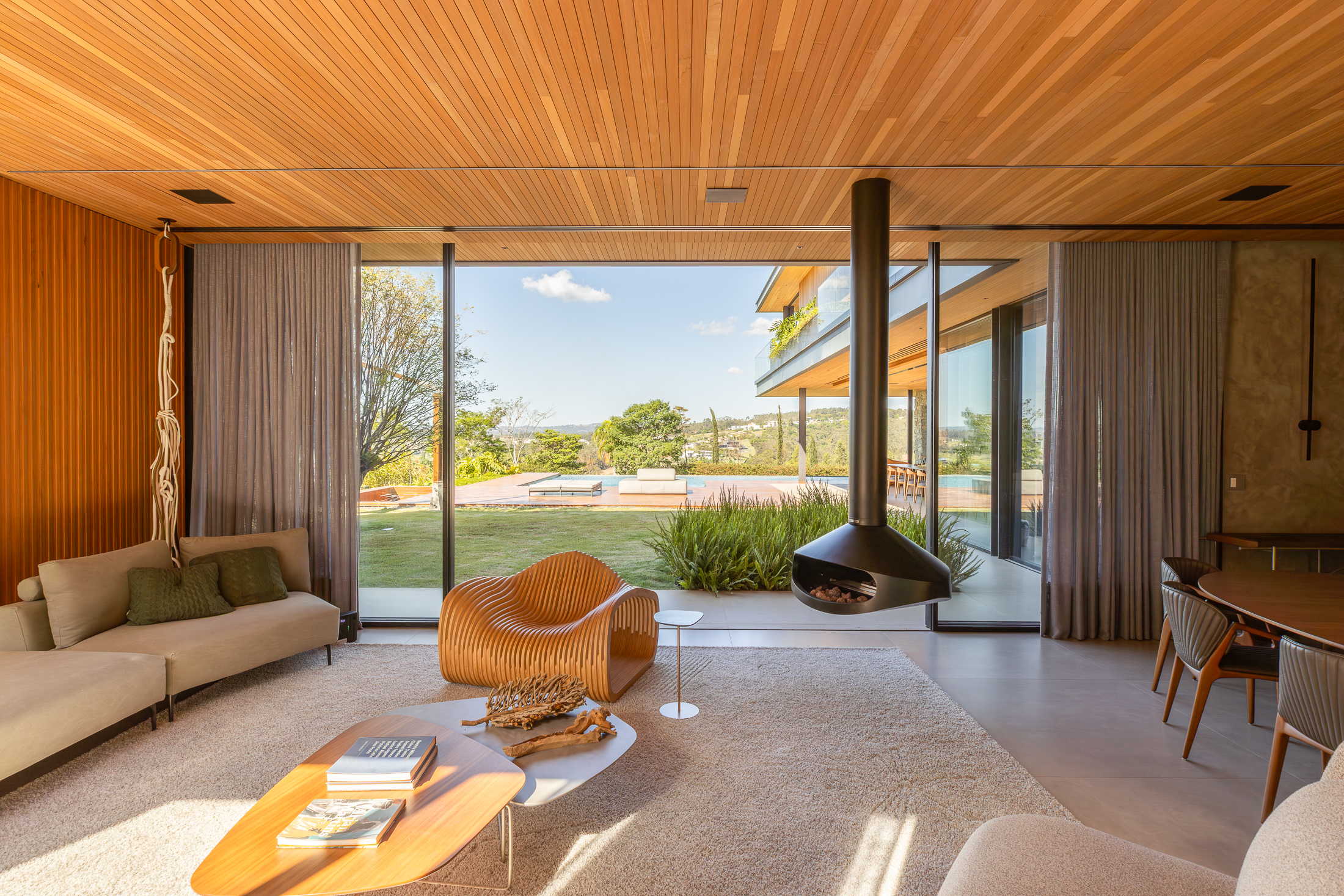O projeto interno prioriza a convivência e a integração total entre sala, cozinha e área externa. A cozinha gourmet, com bancada em ilha, funciona como o coração da casa, conectada a espaços sociais amplos. Grandes painéis de vidro e o forro ripado em madeira trazem luz natural, vistas privilegiadas e uma atmosfera aconchegante, reforçando a relação direta com o jardim.